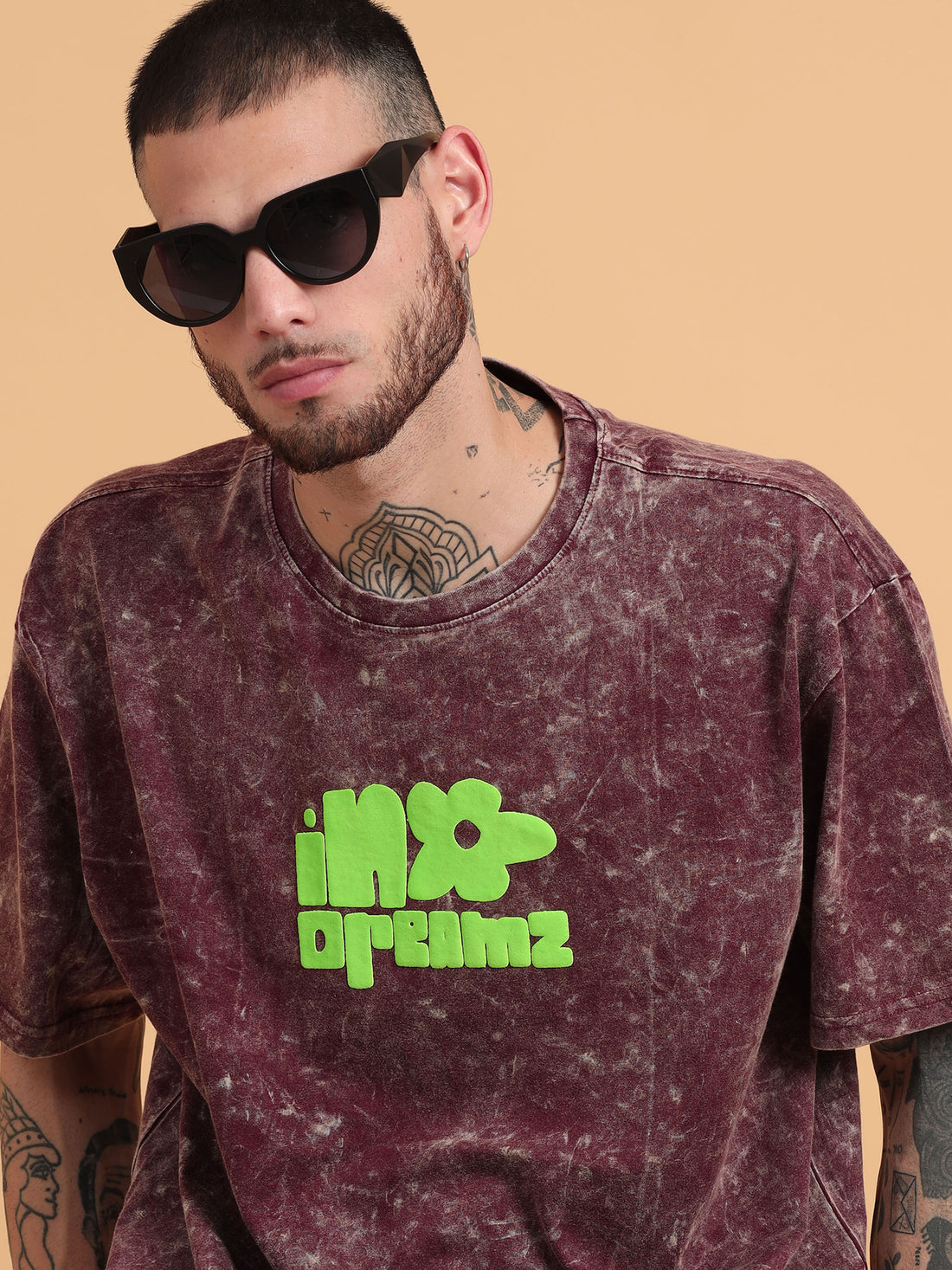Unleash your wild side with our In Dreamz Burgundy Typography Print Acid Wash Oversized Tshirt....