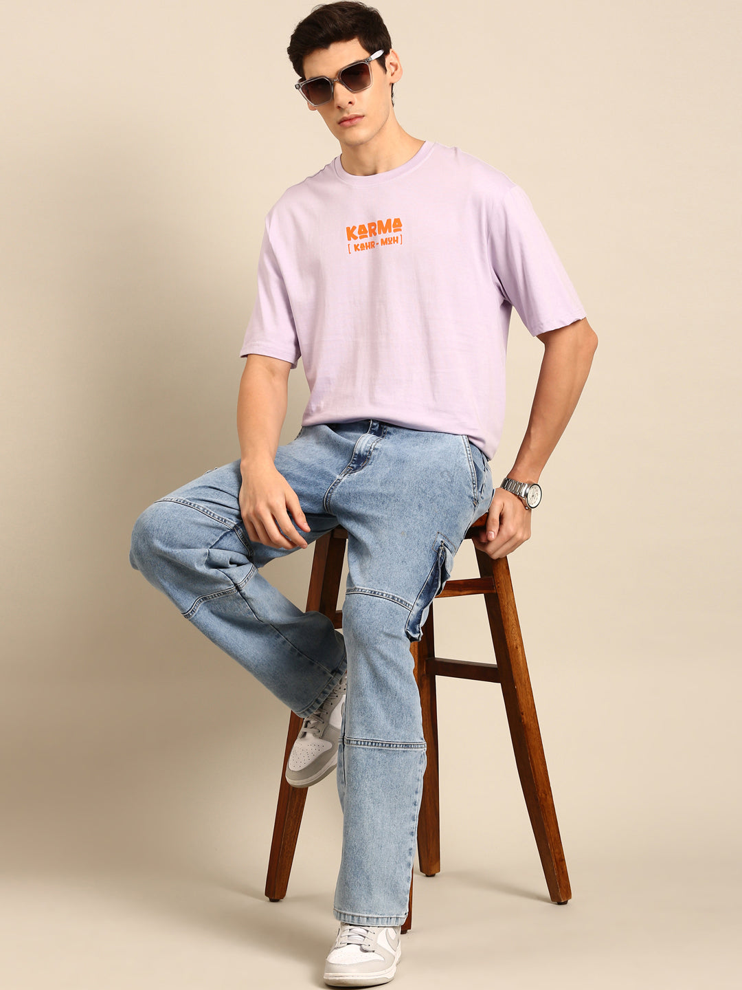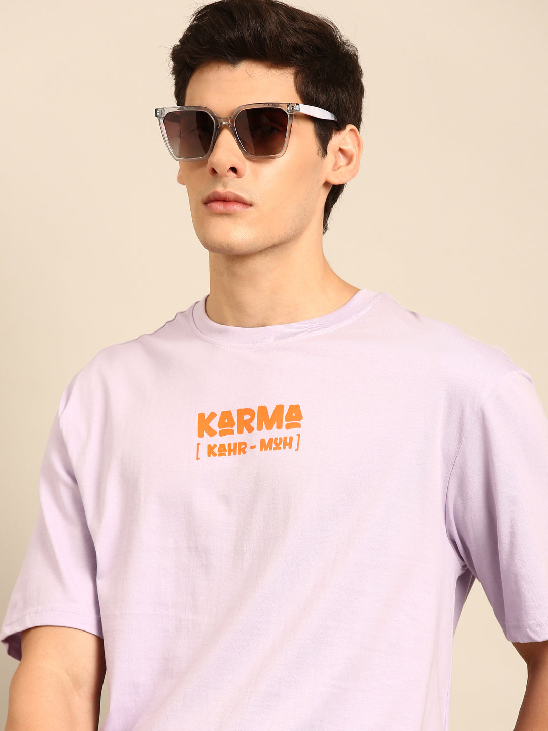 Embrace your inner karma with this oversized fit tshirt in a charming shade of lilac. Featuring a playful typography print, this tshirt is perfect for anyone looking to add a touch of humor and personality to their wardrobe. It's the perfect reminder to always keep a positive outlook on life!