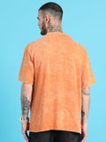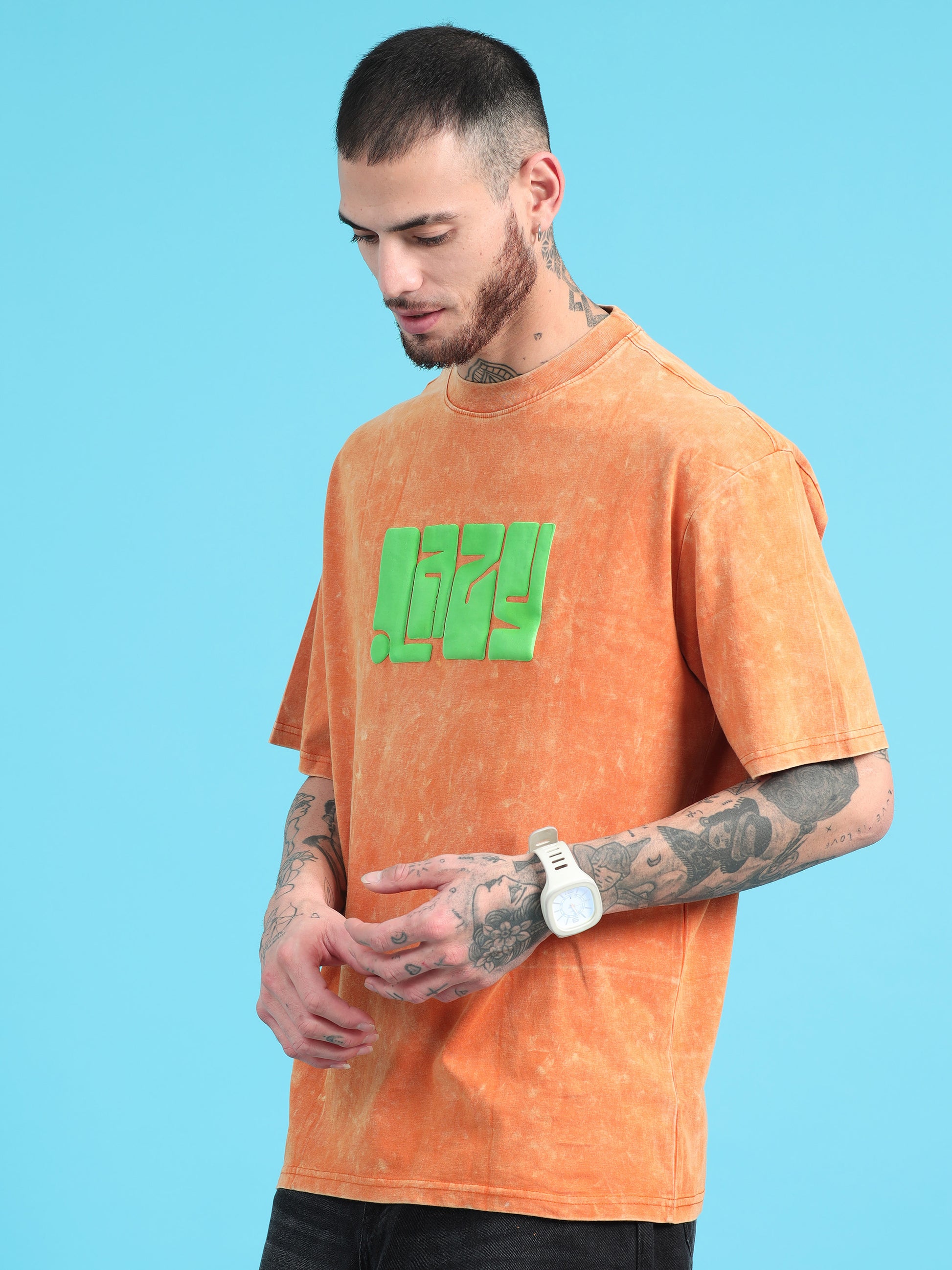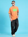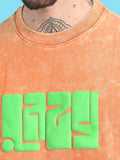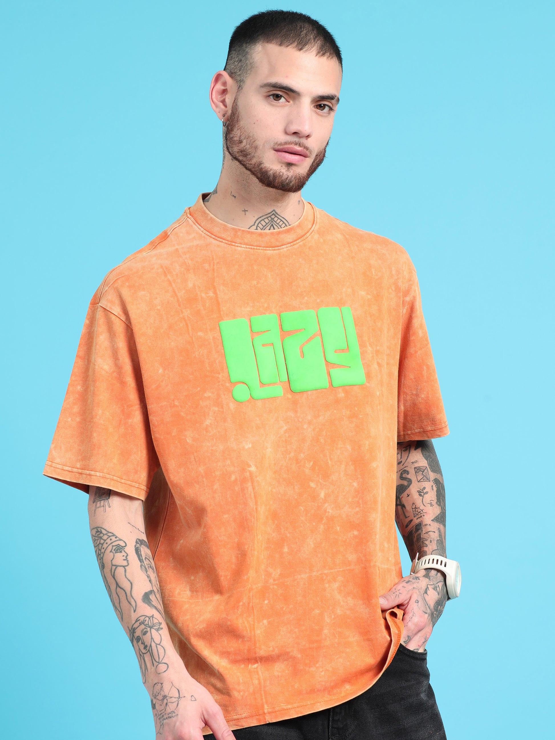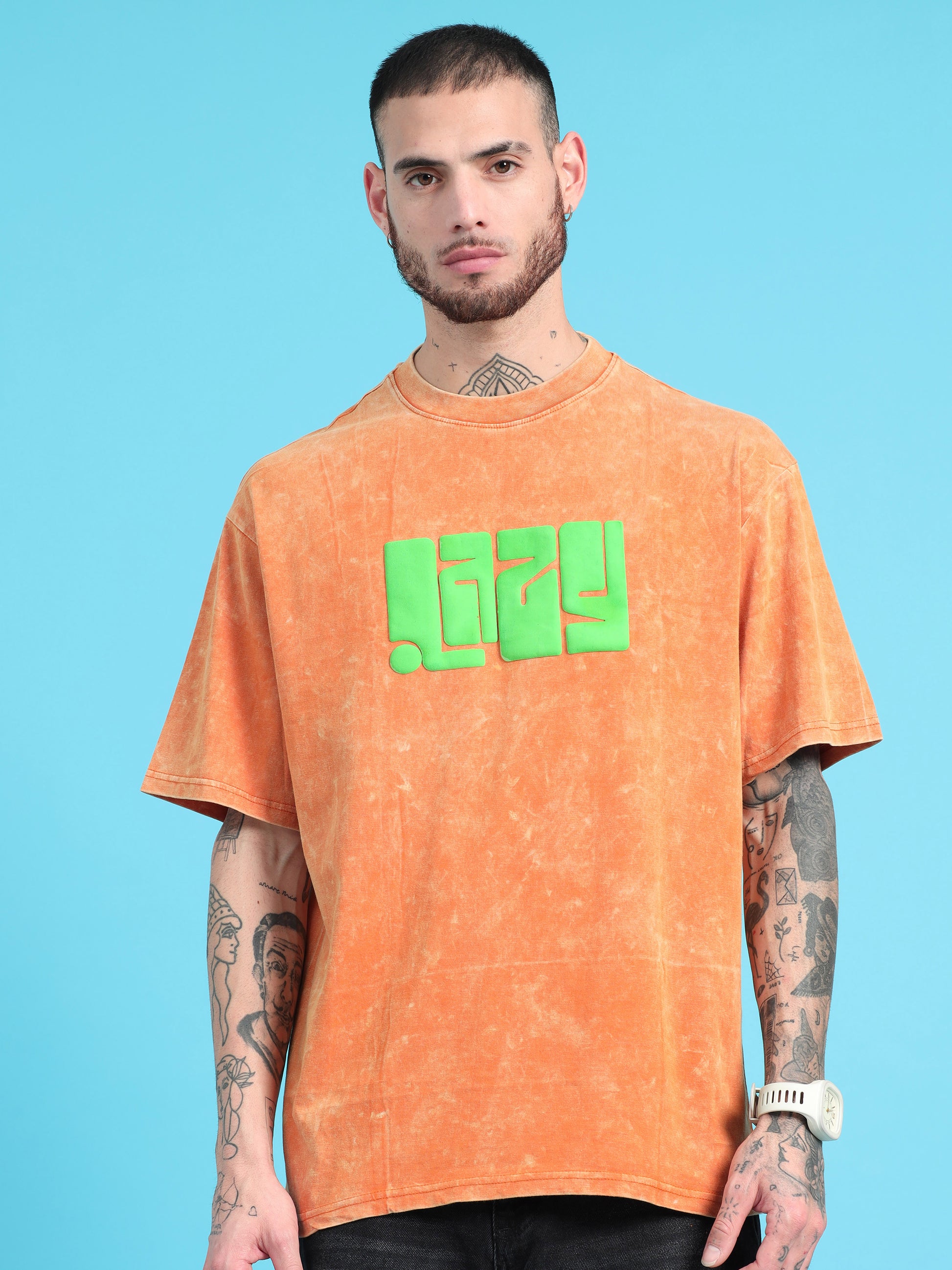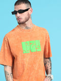 Lazy: Orange Typography puff Print Acid Wash Oversized Tshirt