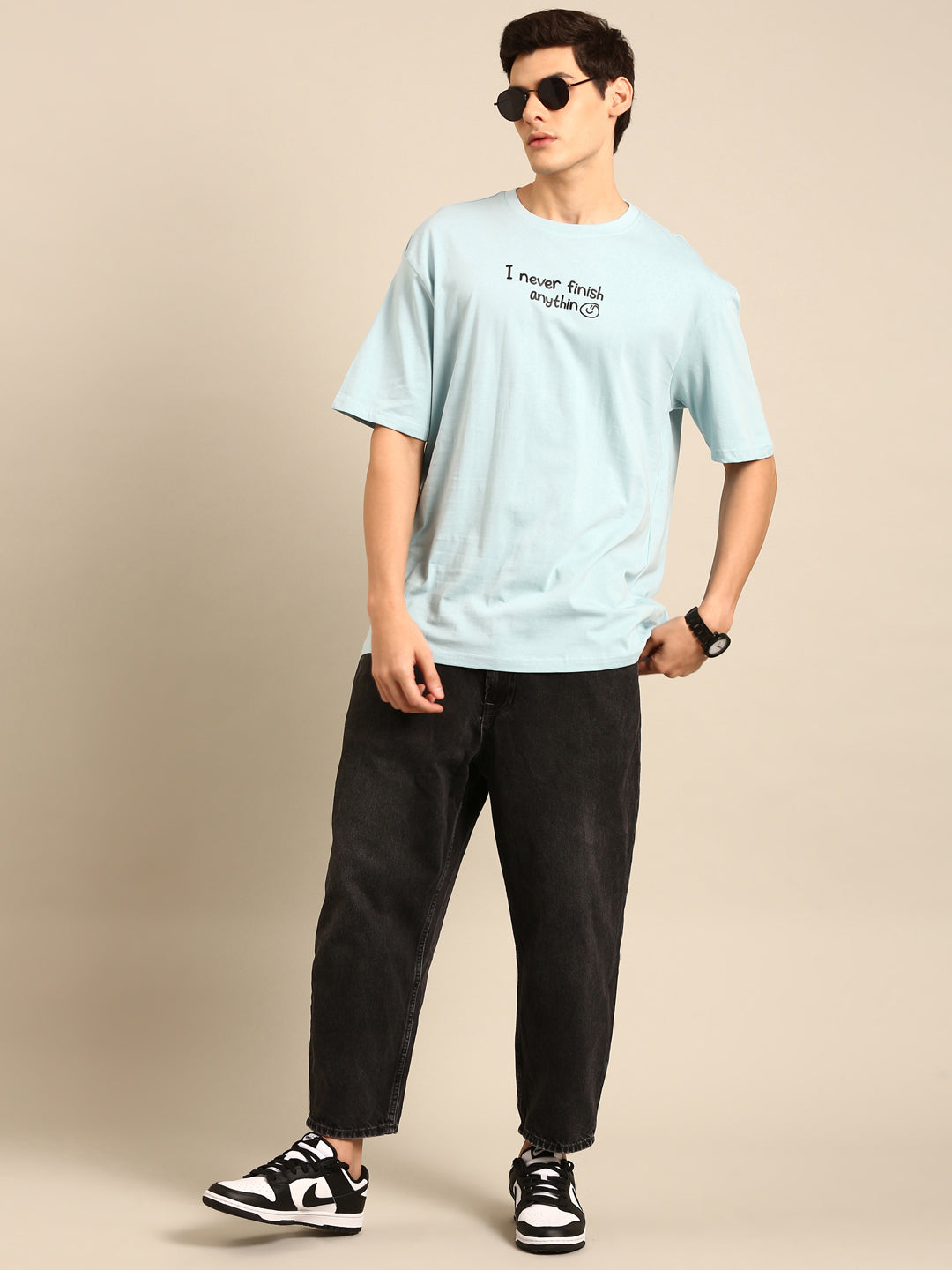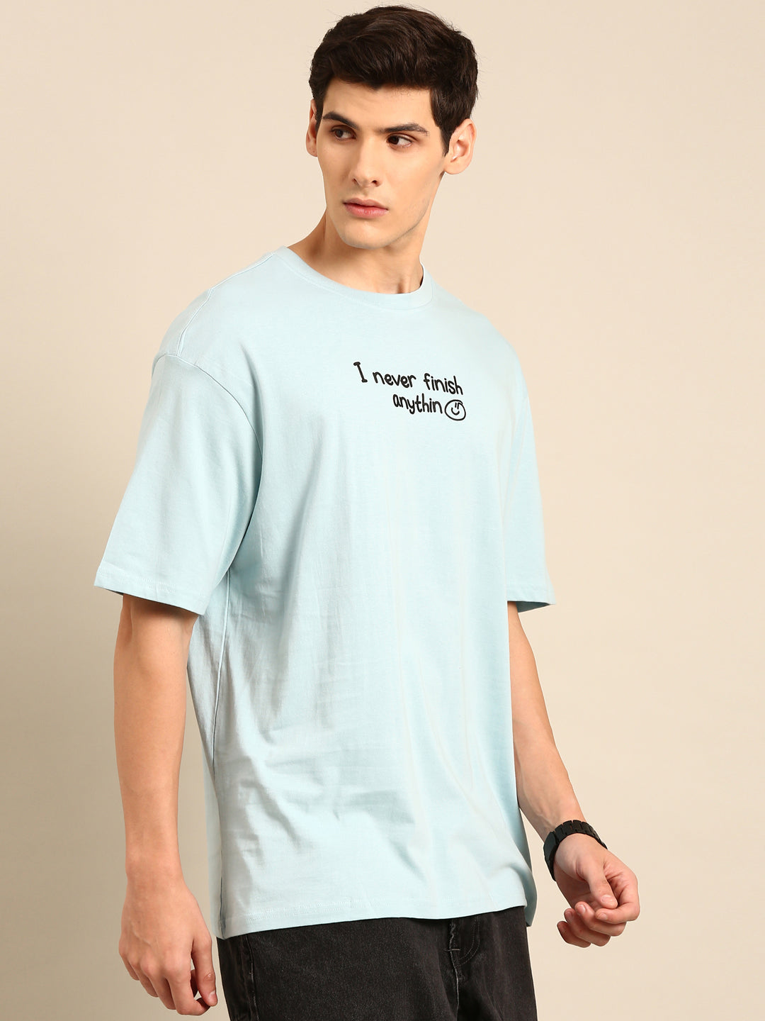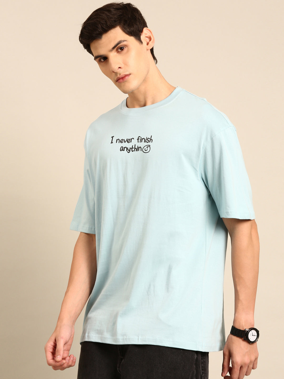 Experience the ultimate in comfort and style with our Never Finish Anything tshirt. Featuring an eye-catching aqua typography print, this oversized fit tshirt is perfect for anyone who wants to make a statement. Don't just start things, finish them in style with our unique tshirt.
