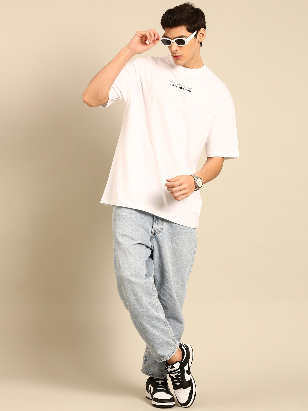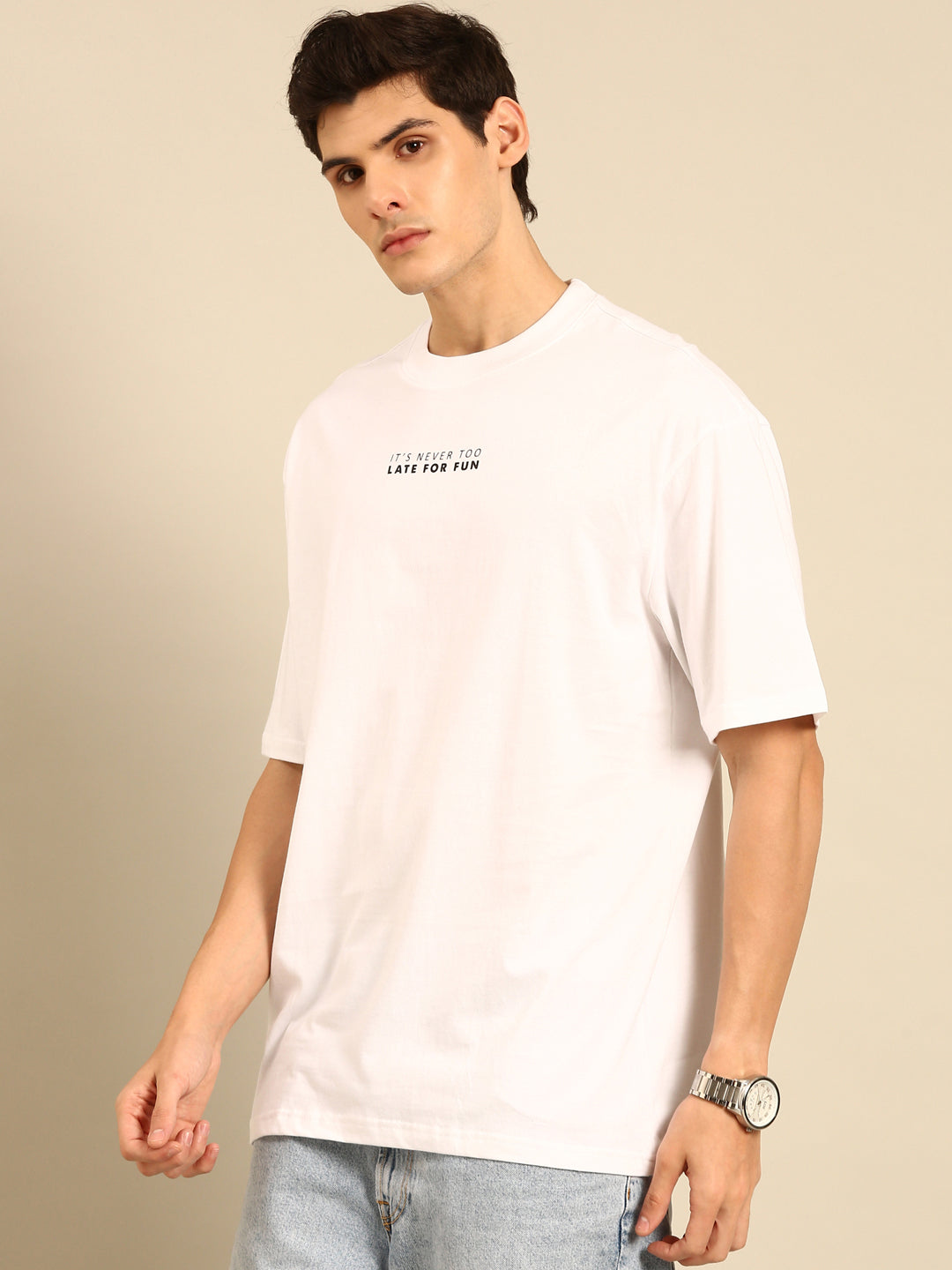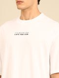 Add some fun to your wardrobe with our Never too Late for Fun T-shirt! Featuring a playful white typography print and an oversized fit, this shirt is sure to make a statement. Don't wait any longer, grab one and stand out in style!
