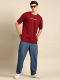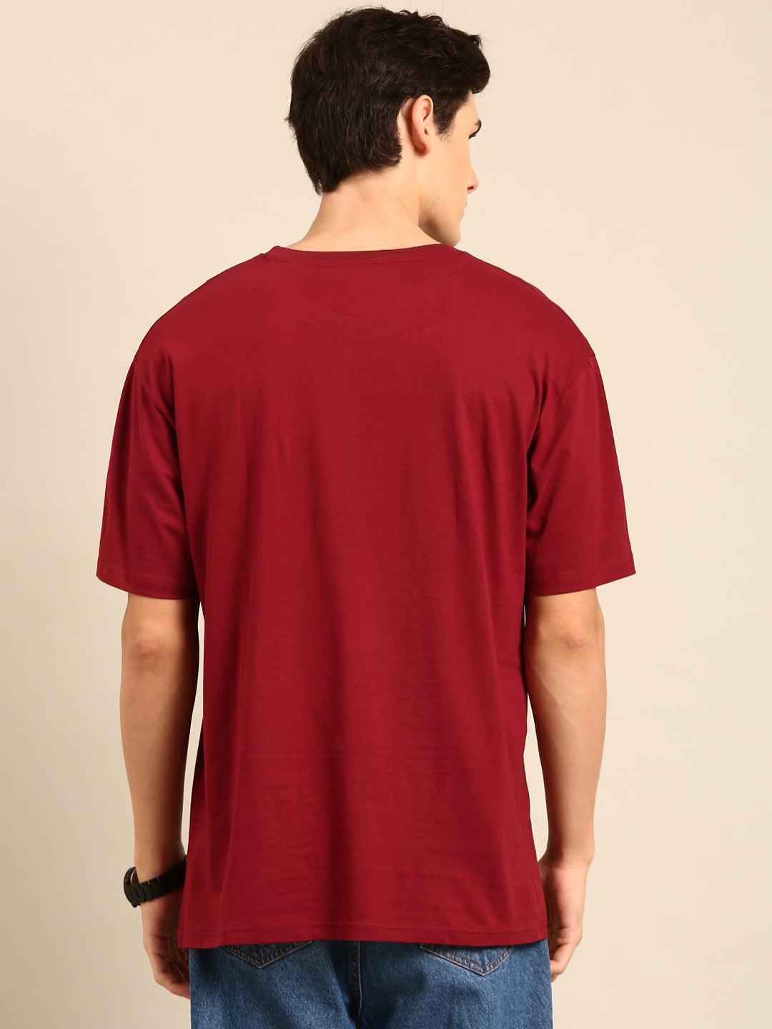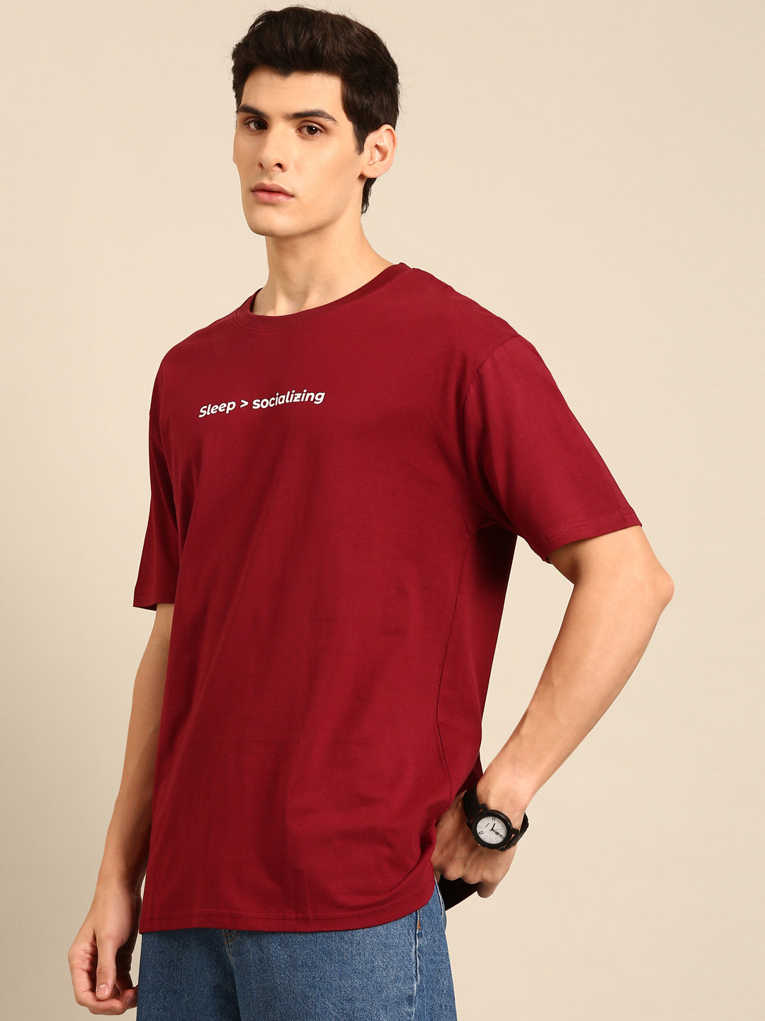 Get some sleep and socialize in our Maroon Typography Print Oversized Fit T-Shirt! This quirky tee will keep you comfortable with its oversized fit and stylish with its unique typography print. Perfect for a casual day out or a cozy night in.