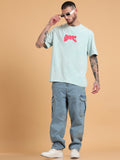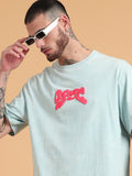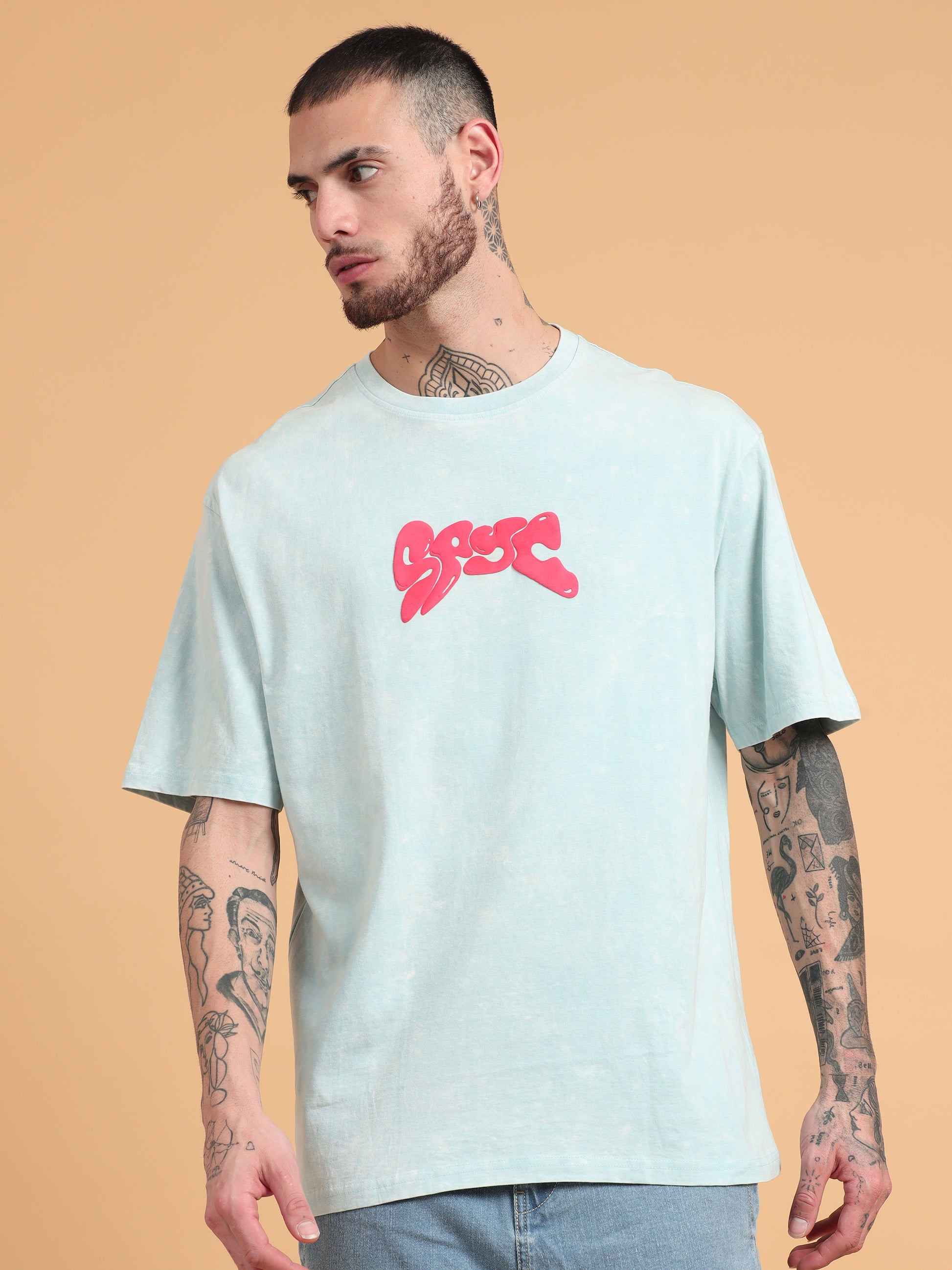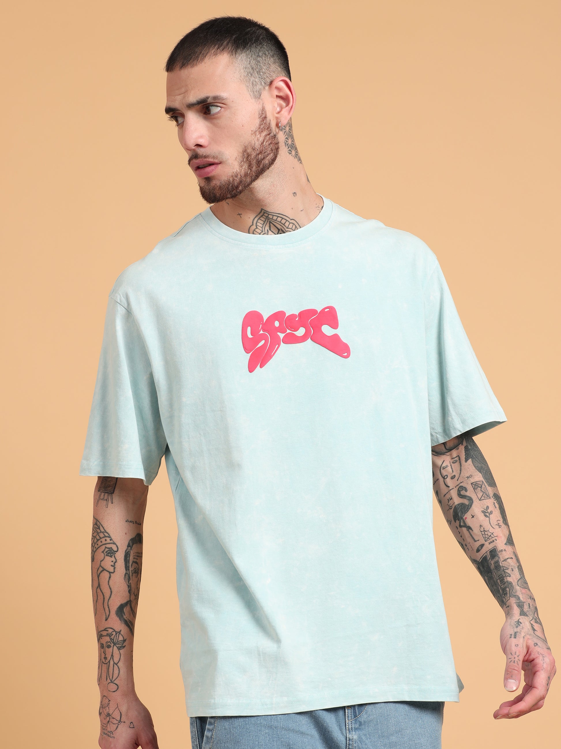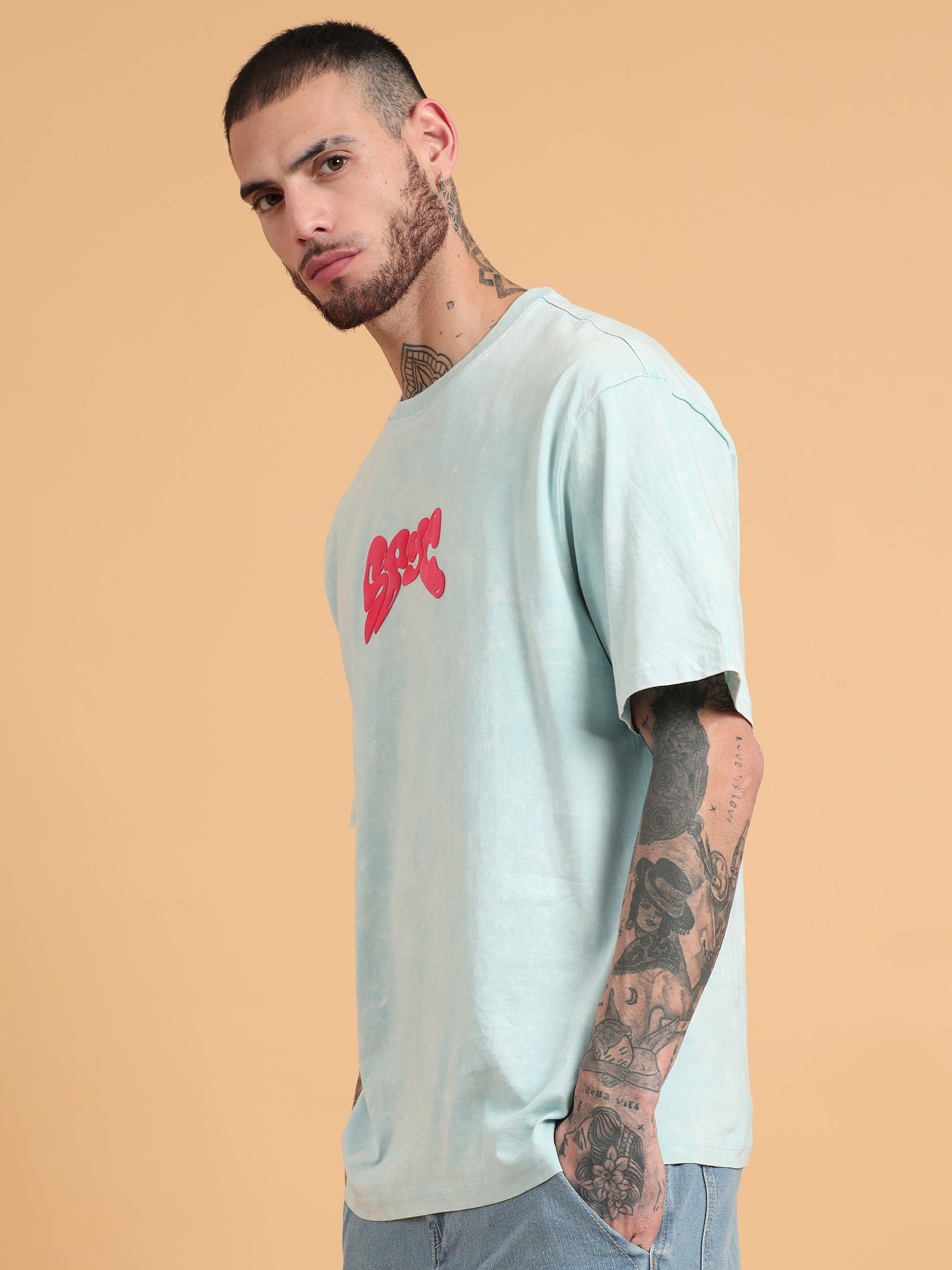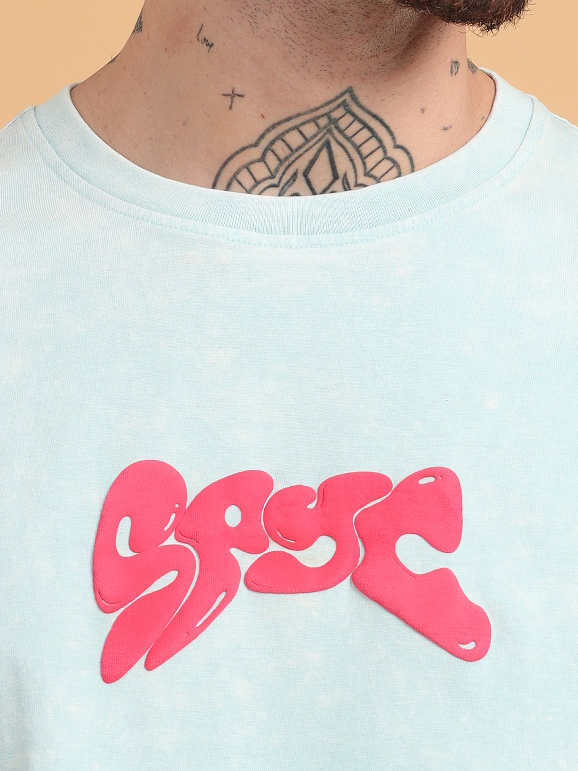 Spyc: Aqua Typography puff Print Acid Wash Oversized Tshirt